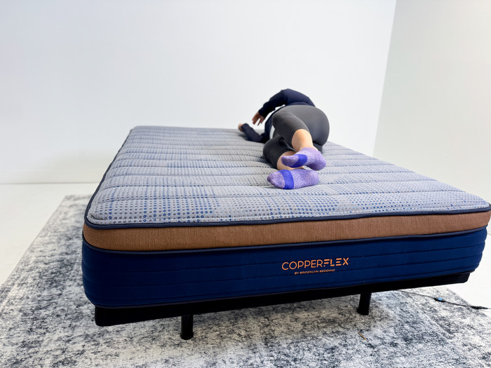 The responsiveness was even more impressive when we factored in the bed’s ability to dampen motion. It’s a bit of an anomaly for a mattress to perform well in both of these categories. However, CopperFlex allows for ease of movement while also preventing any of the effects of that motion from disturbing a partner. Sosha and I tested this feature together. She donned a blindfold and lay stationary on the mattress, while I got in and out of bed and then flipped and flopped like a restless spouse. Sosha said, “I could feel Riley’s presence throughout this test, but it wasn’t disturbing. I am an extremely light sleeper, and I don’t think that enough motion traveled to my side of the bed to disturb me.”
